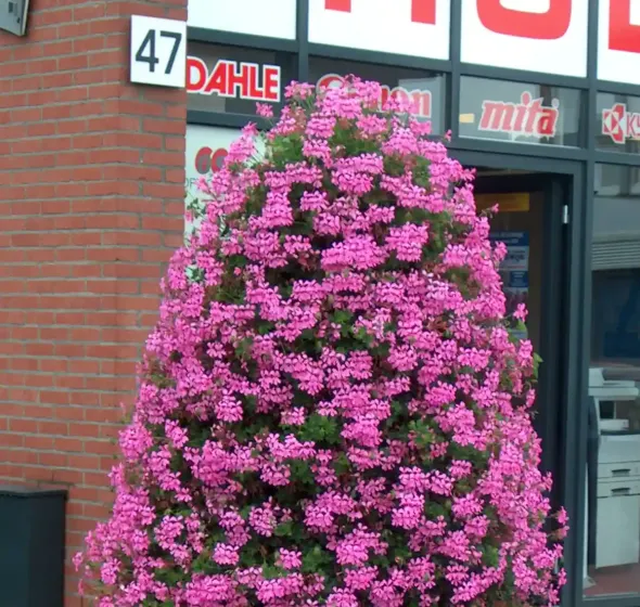Pelargoniakolonn typ 'Voorburg' är en vacker, bred pelare som passar utmärkt för platser med lite mer utrymme. Det är en mycket populär produkt. Pelargonia blommar mycket rikligt långt in på hösten.